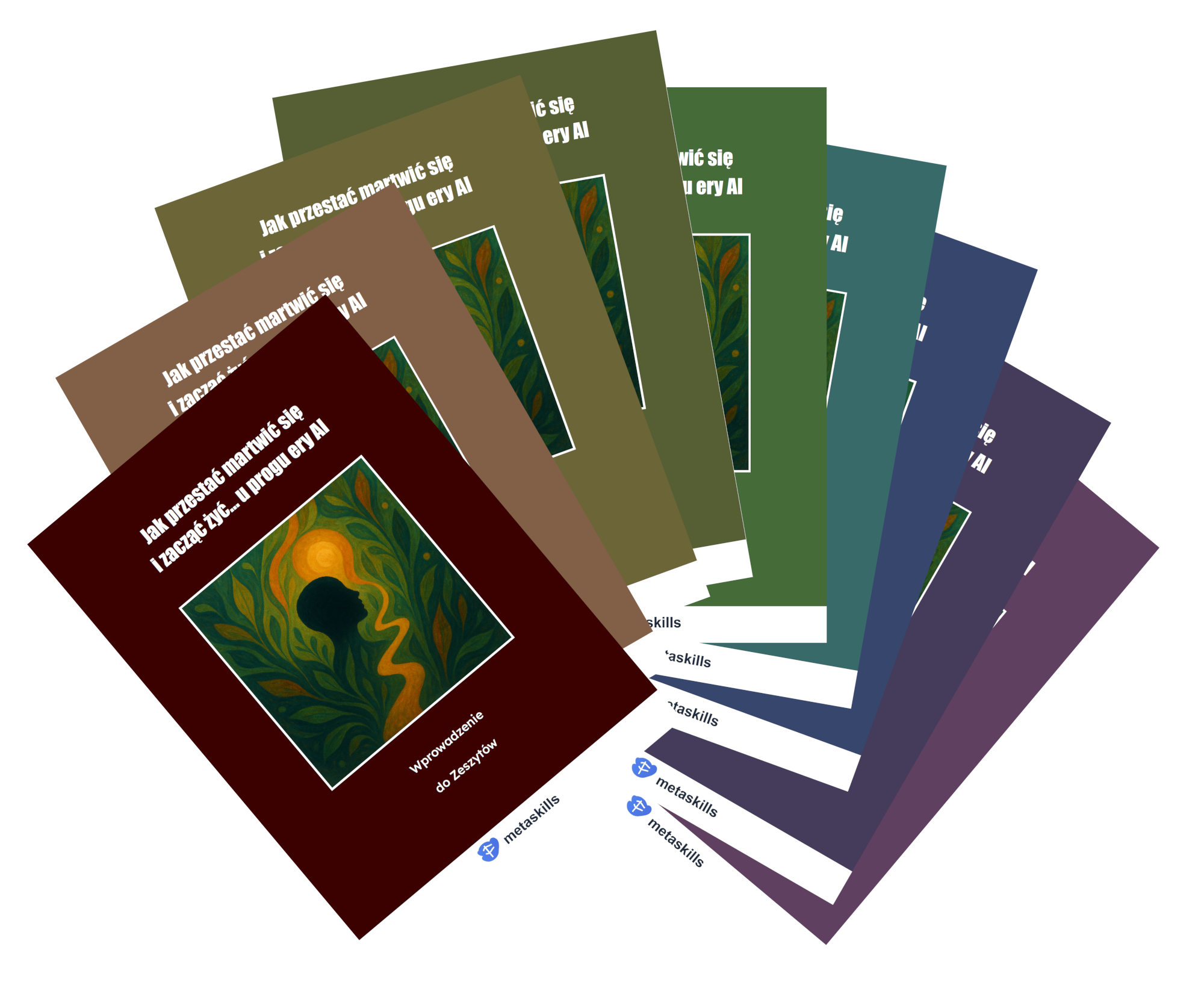 Seria "Jak przestać się martwić i zacząć żyć... u progu ery AI" to osiem etapów od mgły do wolności. Wizja życiowa. Cele. Decyzje. Meta-umiejętności. Narzędzia. Działania. Rozwój. Regeneracja. Każdy zeszyt to praktyczny warsztat - konkretne narzędzia, przykłady, systemy śledzenia postępów. Nie teoria dla teorii. Tylko to, co działa.